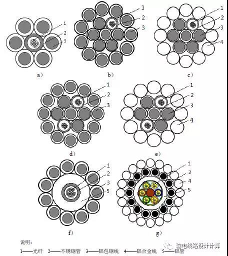 2.5对于单个光单元的 OPGW,中心管式结构如图a)所示,层绞式结构如图b)和c)所示;两个光单元的 OPGW 结构如图d)和图e)所示。铝管型 OPGW 结构如图f)和图g)所示。